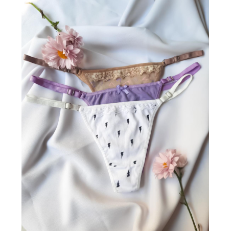 Pack x 3. Cola less regulable de algodón y lycra estampadas con detalle en puntilla o moñitos.